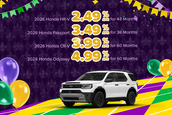APR offers available on select models with approved credit through Honda Financial Services. 2026 Honda HR-V. 2.49% APR for 48 months. $21.91 per month per every $1,000 borrowed. 2026 Honda Passport. 3.49% APR for 36 months. $29.30 per month per every $1,000 borrowed. 2026 Honda CR-V. 3.99% APR for 60 months. $18.41 per month per every $1,000 borrowed. 2026 Honda Odyssey. 4.99% APR for 60 months. $18.87 per month per every $1,000 borrowed. Several available in stock. Vehicle shown is for illustration purposes only. Not all buyers will qualify. Advertised Price EXCLUDES all optional dealer offered items, accessories, or product addendums optionally selected by the purchaser, applicable official taxes and fees, and a $436 documentary fee. Offer Expires 03/02/2026.